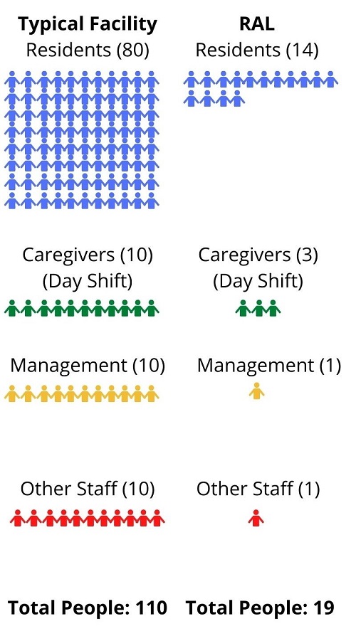 RALs have less traffic (residents and staff) and less square footage to disinfect. Additionally, the lower caregiver to resident ratio provides for closer monitoring of the residents for early detection of any changes in their conditions, eating, sleeping or behavior. RALs have been shown to also reduce the level of stress and depression.